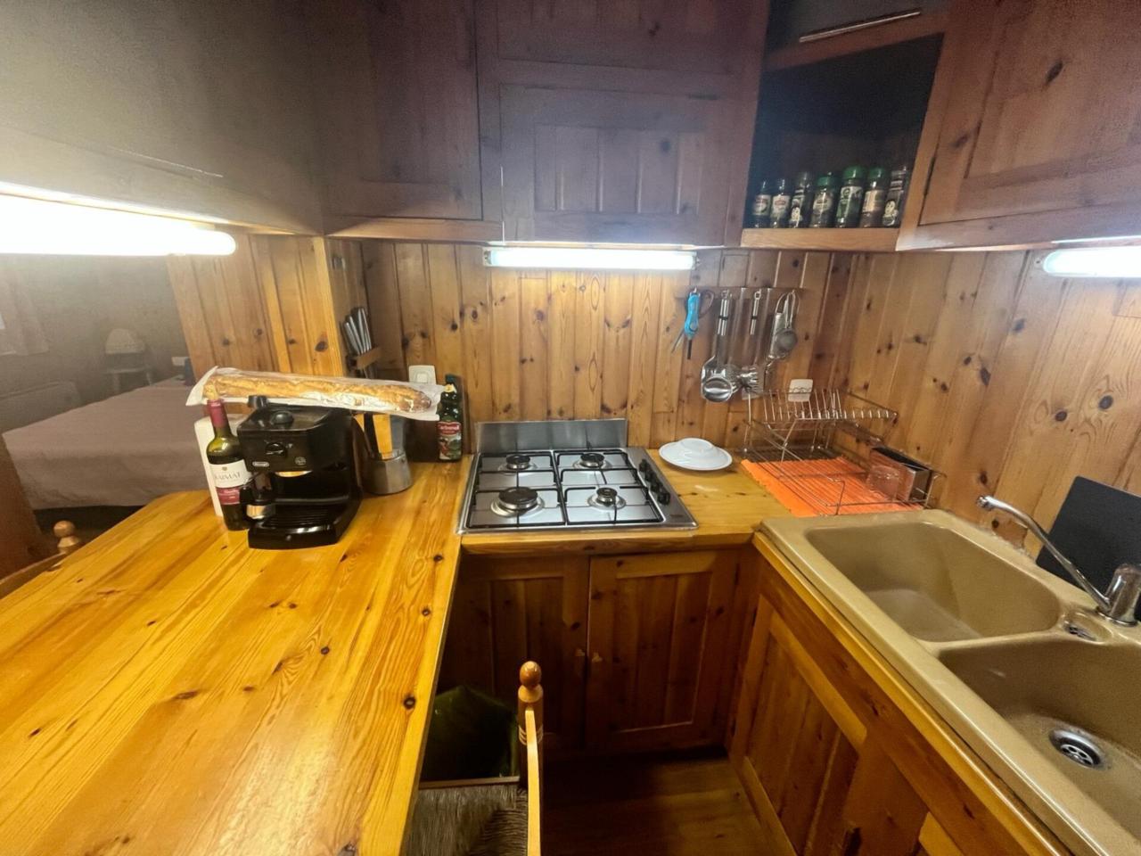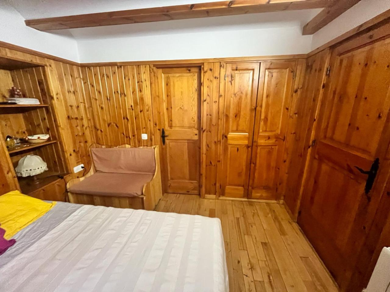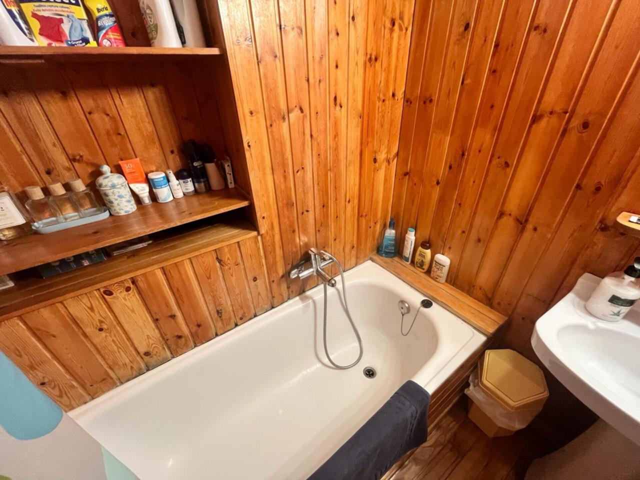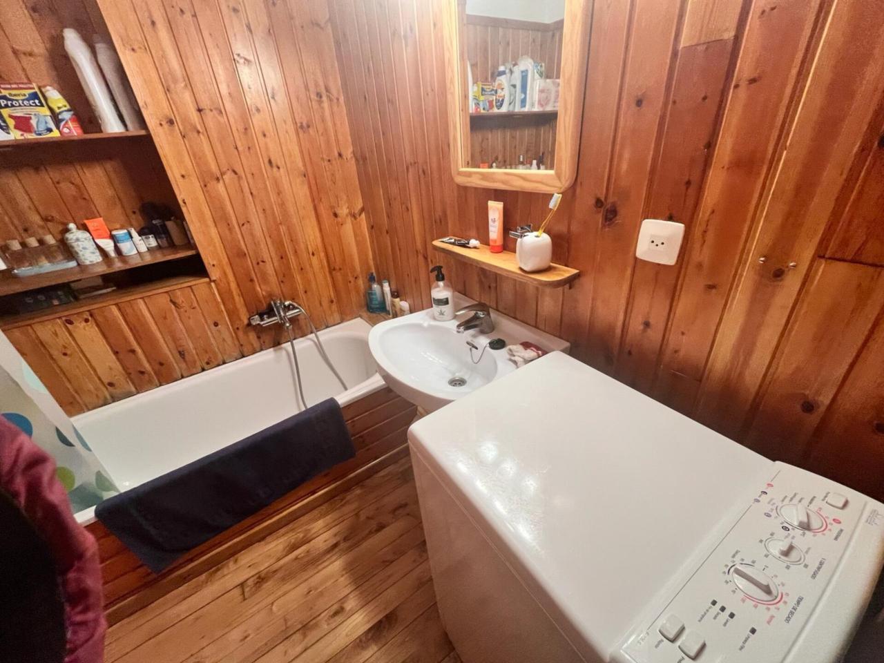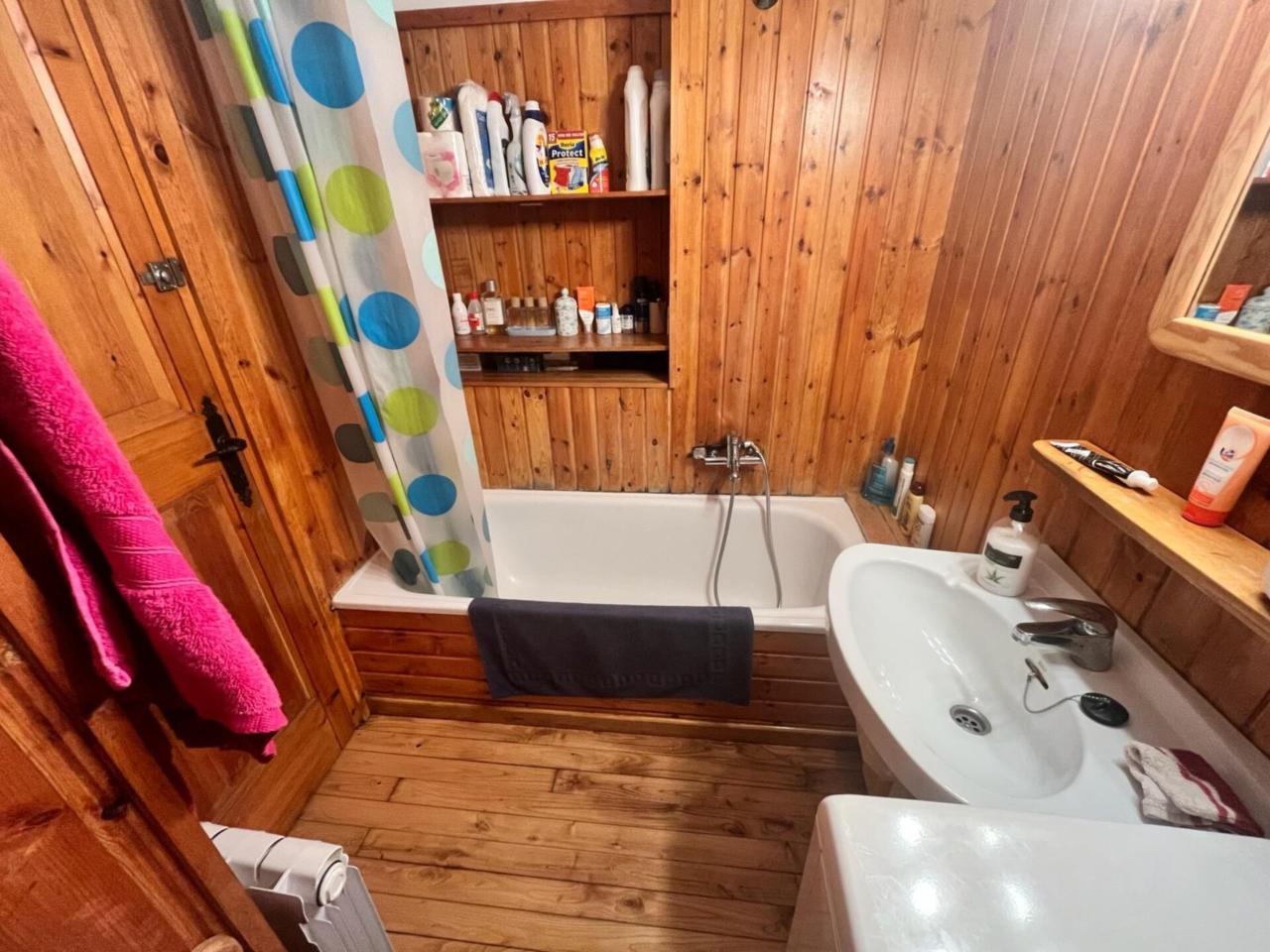 Cocina-comedor equipada Salón con chimenea Dormitorio con cama matrimonial Baño con bañera Capacidad para 8 personas: 3 sofás-cama en salón/comedor y una cama de 140 cm en el dormitorio Suelos de parquet de madera de castaño Paredes exteriores de 60 cm con revestimiento interior en madera
